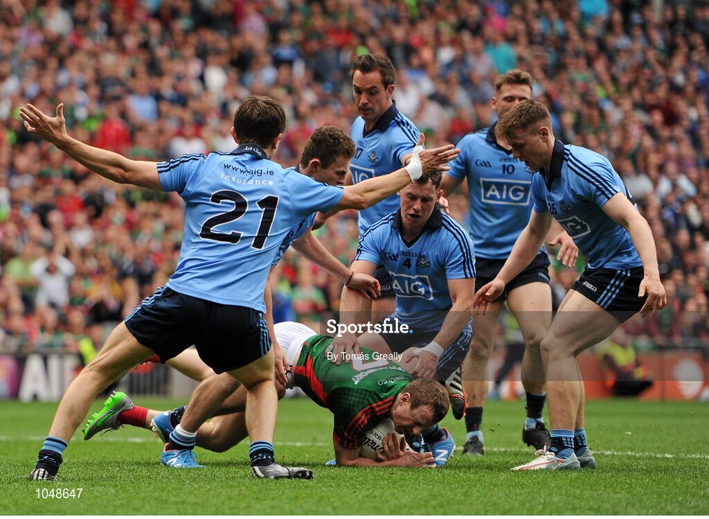 30 August 2015; Colm Boyle, Mayo, surrounded by Dublin players, from left, Michael Fitzsimons, 21, left, Jack McCaffrey, Tomás Brady, 17, Philly McMahon, 4, Paul Flynn, 10, and far right John Small, after being foulded inside the penalty area. GAA Football All-Ireland Senior Championship, Semi-Final, Dublin v Mayo, Croke Park, Dublin. Picture credit Tomás Greally / SPORTSFILE