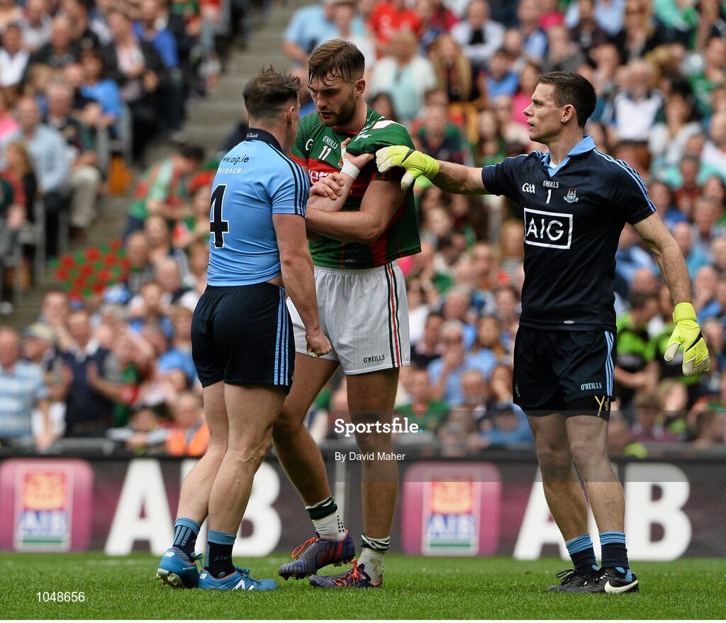 30 August 2015; Philip McMahon, Dublin, and Aidan O'Shea, Mayo, confront each other. GAA Football All-Ireland Senior Championship, Semi-Final, Dublin v Mayo, Croke Park, Dublin. Picture credit: David Maher / SPORTSFILE