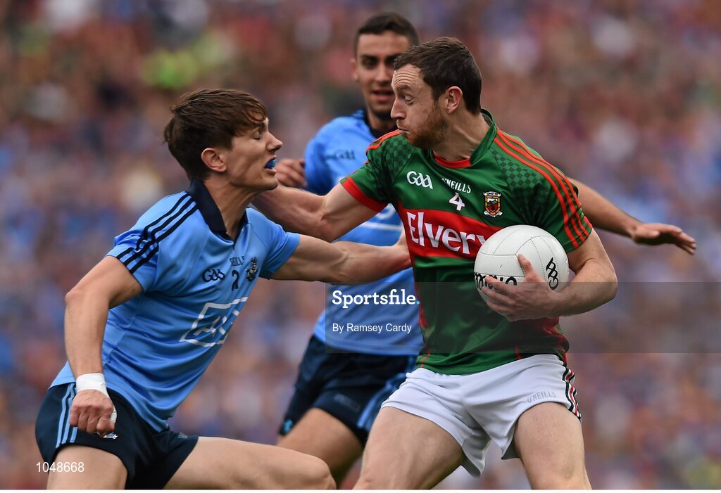 30 August 2015; Keith Higgins, Mayo, in action against Michael Fitzsimons, Dublin. GAA Football All-Ireland Senior Championship, Semi-Final, Dublin v Mayo, Croke Park, Dublin. Picture credit: Ramsey Cardy / SPORTSFILE
