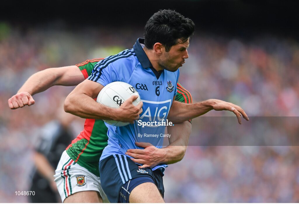30 August 2015; Cian O'Sullivan, Dublin, is tackled by Aidan O'Shea, Mayo. GAA Football All-Ireland Senior Championship, Semi-Final, Dublin v Mayo, Croke Park, Dublin. Picture credit: Ramsey Cardy / SPORTSFILE