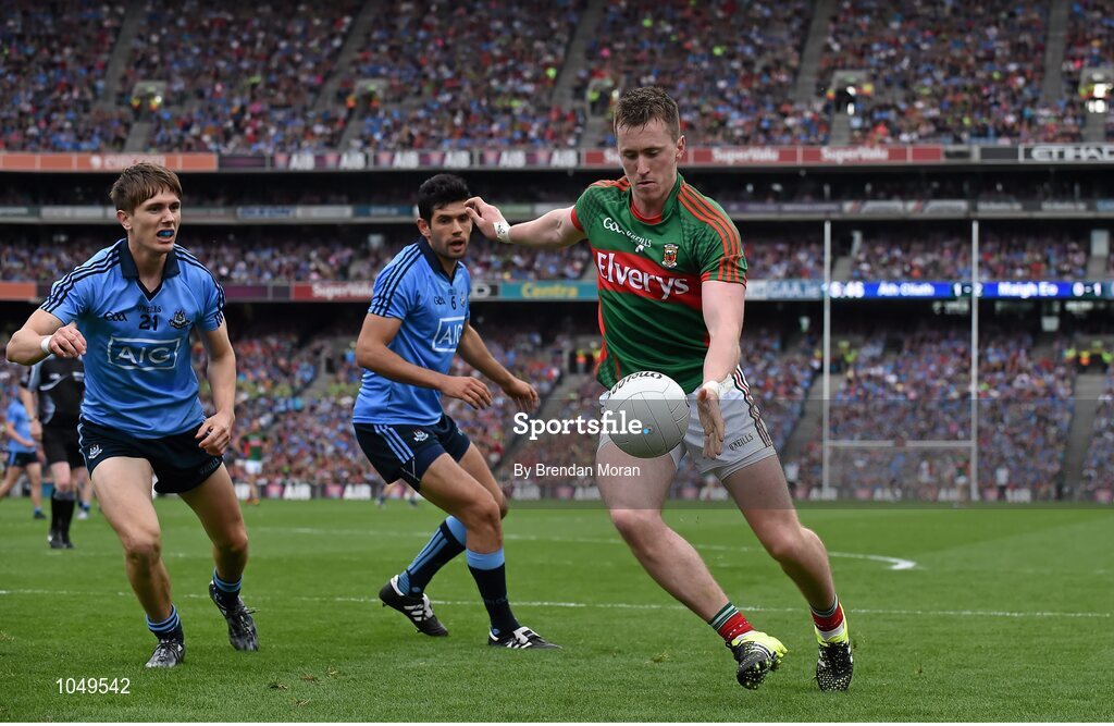 30 August 2015; Cillian O'Connor, Mayo, in action against Michael Fitzsimons, left, and Cian O'Sullivan, Dublin. GAA Football All-Ireland Senior Championship, Semi-Final, Dublin v Mayo, Croke Park, Dublin. Picture credit: Brendan Moran / SPORTSFILE
