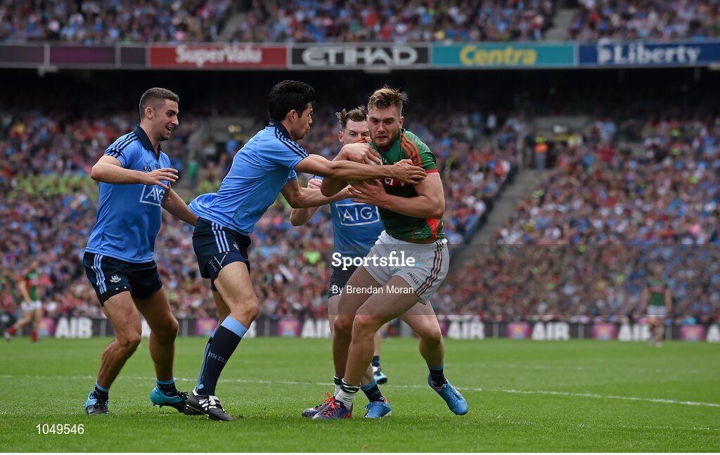30 August 2015; Aidan O'Shea, Mayo, in action against Dublin players, from left, James McCarthy, Cian O'Sullivan and Philly McMahon. GAA Football All-Ireland Senior Championship, Semi-Final, Dublin v Mayo, Croke Park, Dublin. Picture credit: Brendan Moran / SPORTSFILE
