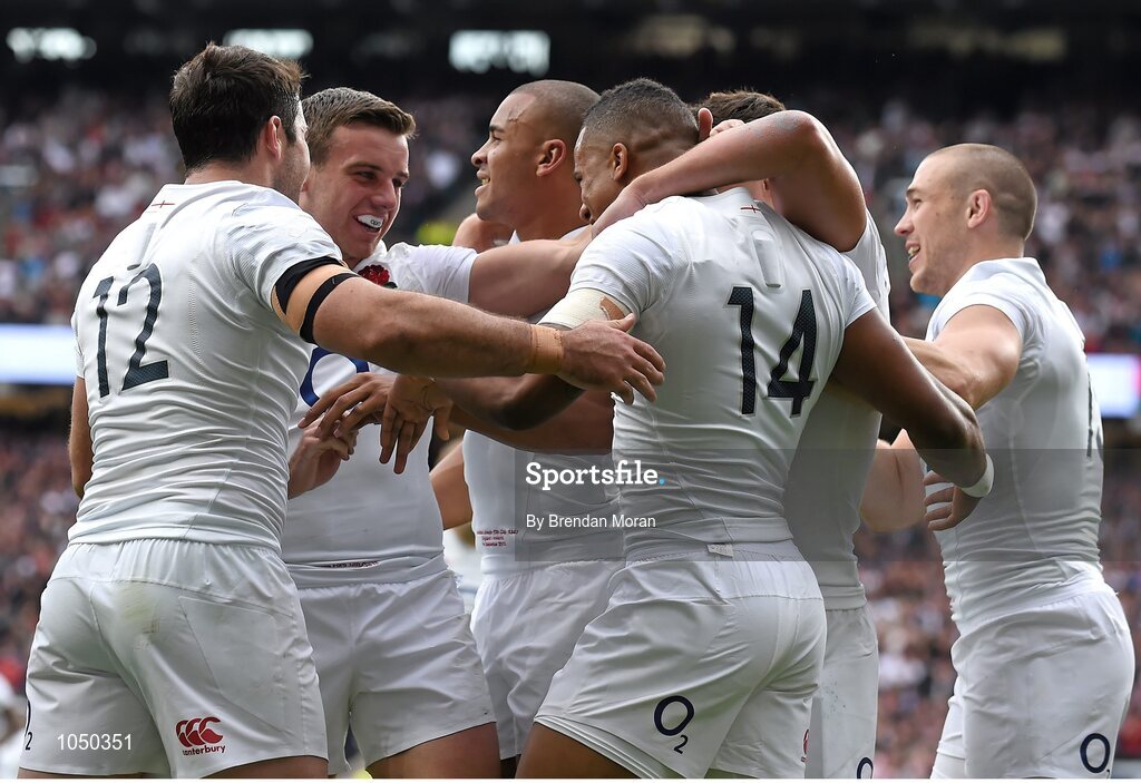 5 September 2015; England players congratulate team-mate Anthony Watson, 14, after he scored their side's second try. Rugby World Cup Warm-Up Match, England v Ireland. Twickenham Stadium, London, England. Picture credit: Brendan Moran / SPORTSFILE