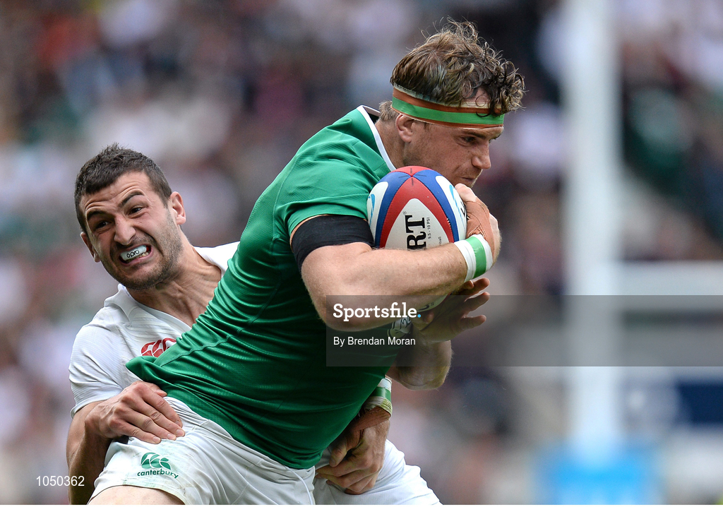 5 September 2015; Jamie Heaslip, Ireland, is tackled by Jonny May, England. Rugby World Cup Warm-Up Match, England v Ireland. Twickenham Stadium, London, England. Picture credit: Brendan Moran / SPORTSFILE