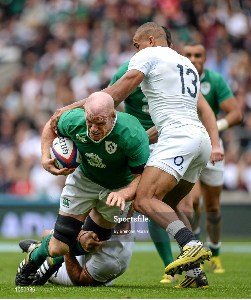 5 September 2015; Paul O'Connell, Ireland, is tackled by Chris Robshaw and Jonathan Joseph, England. Rugby World Cup Warm-Up Match, England v Ireland. Twickenham Stadium, London, England. Picture credit: Brendan Moran / SPORTSFILE