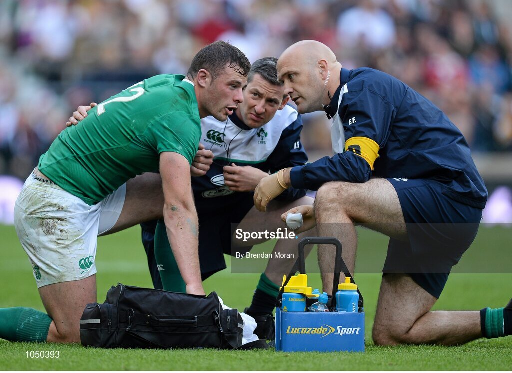 5 September 2015; Robbie Henshaw, Ireland, is attended to by team doctor Dr. Eanna Falvey before leaving the pitch. Rugby World Cup Warm-Up Match, England v Ireland. Twickenham Stadium, London, England. Picture credit: Brendan Moran / SPORTSFILE