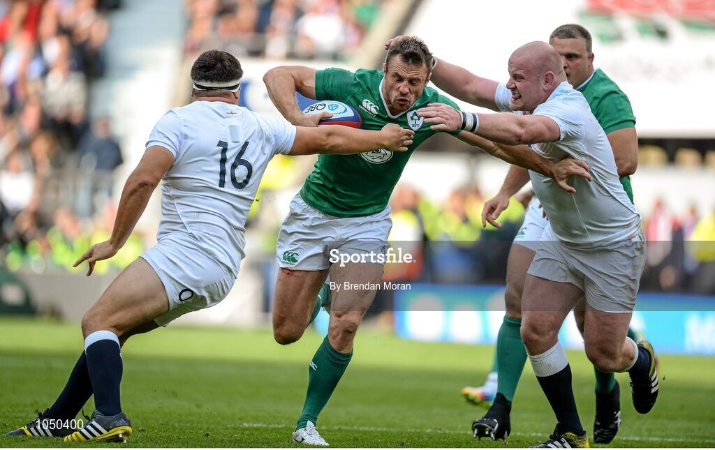 5 September 2015; Tommy Bowe, Ireland, is tackled by Jamie George, left, and Dan Cole, England. Rugby World Cup Warm-Up Match, England v Ireland. Twickenham Stadium, London, England. Picture credit: Brendan Moran / SPORTSFILE