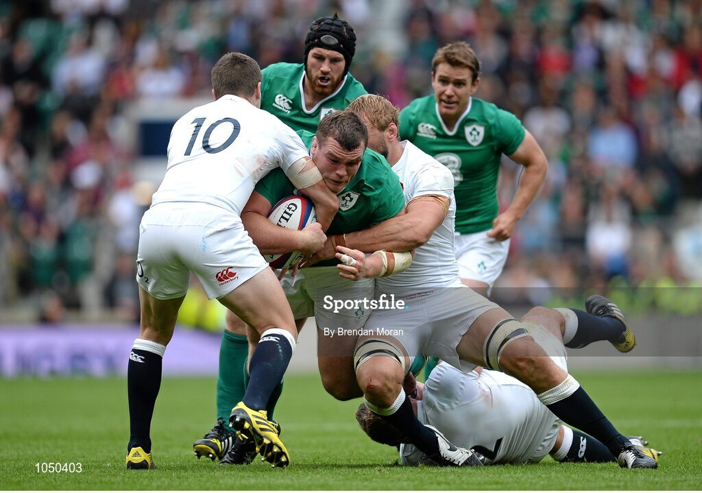 5 September 2015; Jack McGrath, Ireland, is tackled by George Ford, Chris Robshaw and Tom Youngs, England. Rugby World Cup Warm-Up Match, England v Ireland. Twickenham Stadium, London, England. Picture credit: Brendan Moran / SPORTSFILE