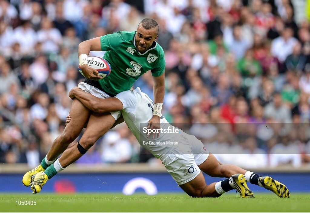 5 September 2015; Simon Zebo, Ireland, is tackled by Jonathan Joseph, England. Rugby World Cup Warm-Up Match, England v Ireland. Twickenham Stadium, London, England. Picture credit: Brendan Moran / SPORTSFILE