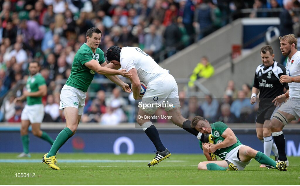 5 September 2015; Ben Morgan, England, is tackled by Jonathan Sexton, left, and Eoin Reddan, Ireland. Rugby World Cup Warm-Up Match, England v Ireland. Twickenham Stadium, London, England. Picture credit: Brendan Moran / SPORTSFILE