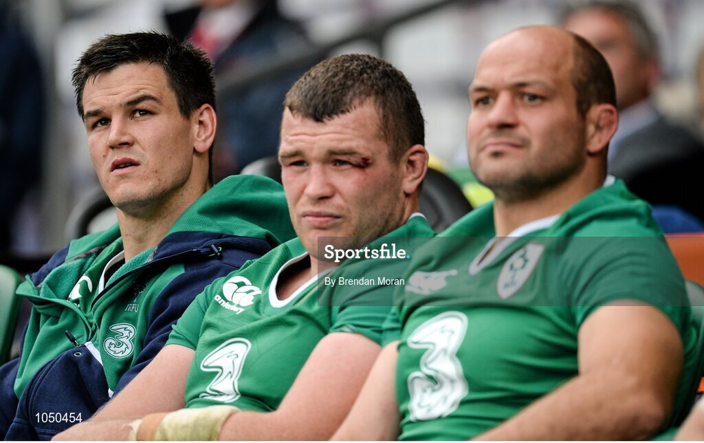 5 September 2015; Ireland players, from left, Jonathan Sexton, Jack McGrath and Rory Best watch the final moments of the game. Rugby World Cup Warm-Up Match, England v Ireland. Twickenham Stadium, London, England. Picture credit: Brendan Moran / SPORTSFILE
