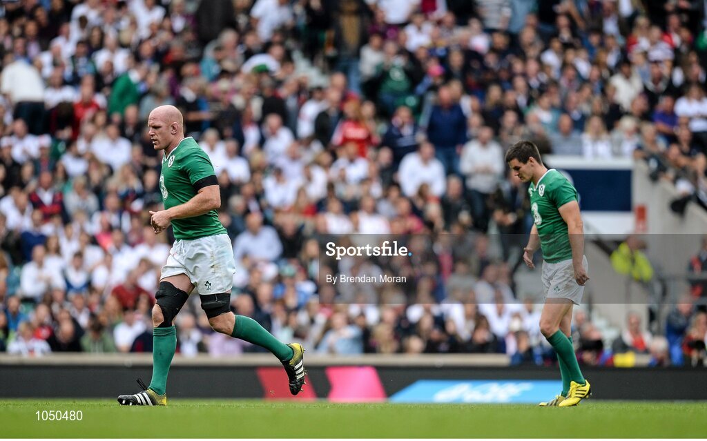 5 September 2015; Ireland's Paul O'Connell, left, and Jonathan Sexton are substituted during the second half. Rugby World Cup Warm-Up Match, England v Ireland. Twickenham Stadium, London, England. Picture credit: Brendan Moran / SPORTSFILE
