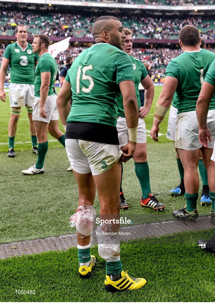 5 September 2015; Ireland's Simon Zebo with ice packs on his calves after the game. Rugby World Cup Warm-Up Match, England v Ireland. Twickenham Stadium, London, England. Picture credit: Brendan Moran / SPORTSFILE