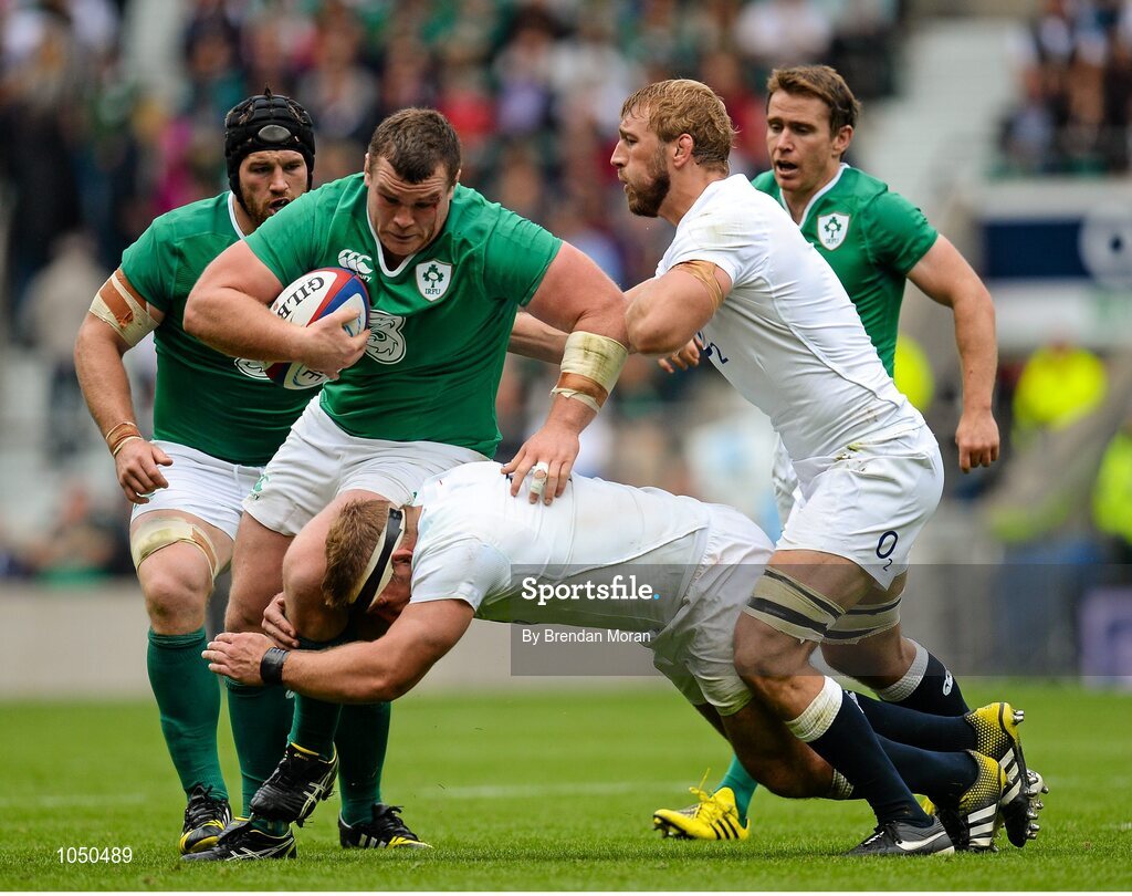 5 September 2015; Jack McGrath, Ireland, is tackled by Tom Youngs, and Chris Robshaw, England. Rugby World Cup Warm-Up Match, England v Ireland. Twickenham Stadium, London, England. Picture credit: Brendan Moran / SPORTSFILE