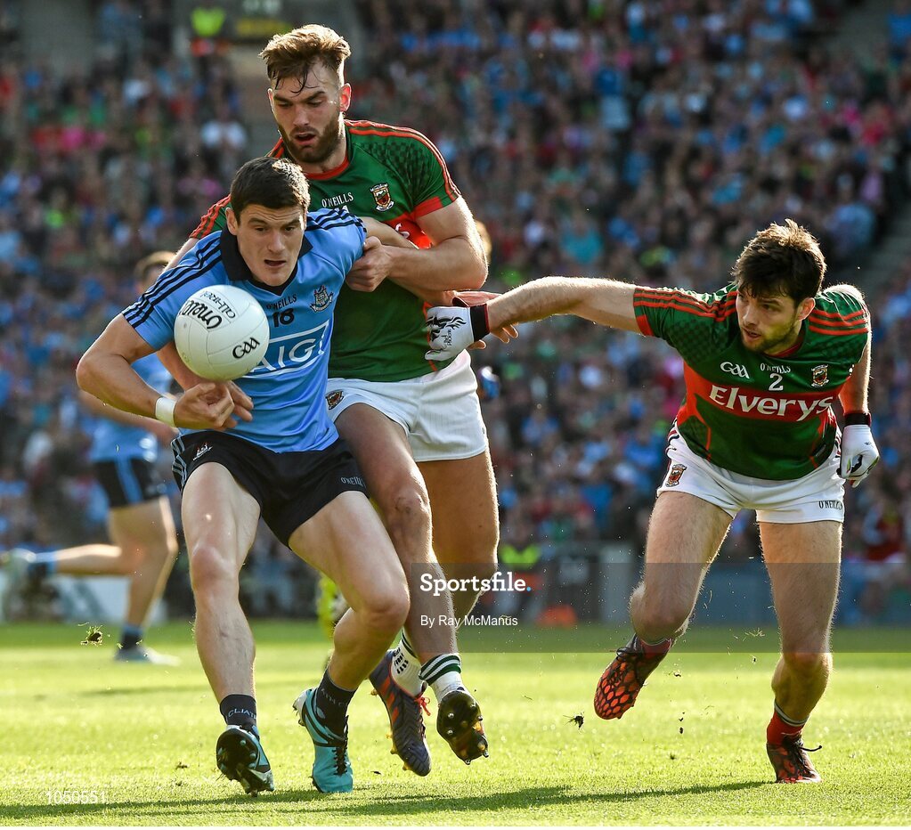 5 September 2015; Diarmuid Connolly, Dublin, is tackled by Aidan O'Shea and Ger Cafferkey, right, Mayo. GAA Football All-Ireland Senior Championship Semi-Final Replay, Dublin v Mayo. Croke Park, Dublin. Picture credit: Ray McManus / SPORTSFILE