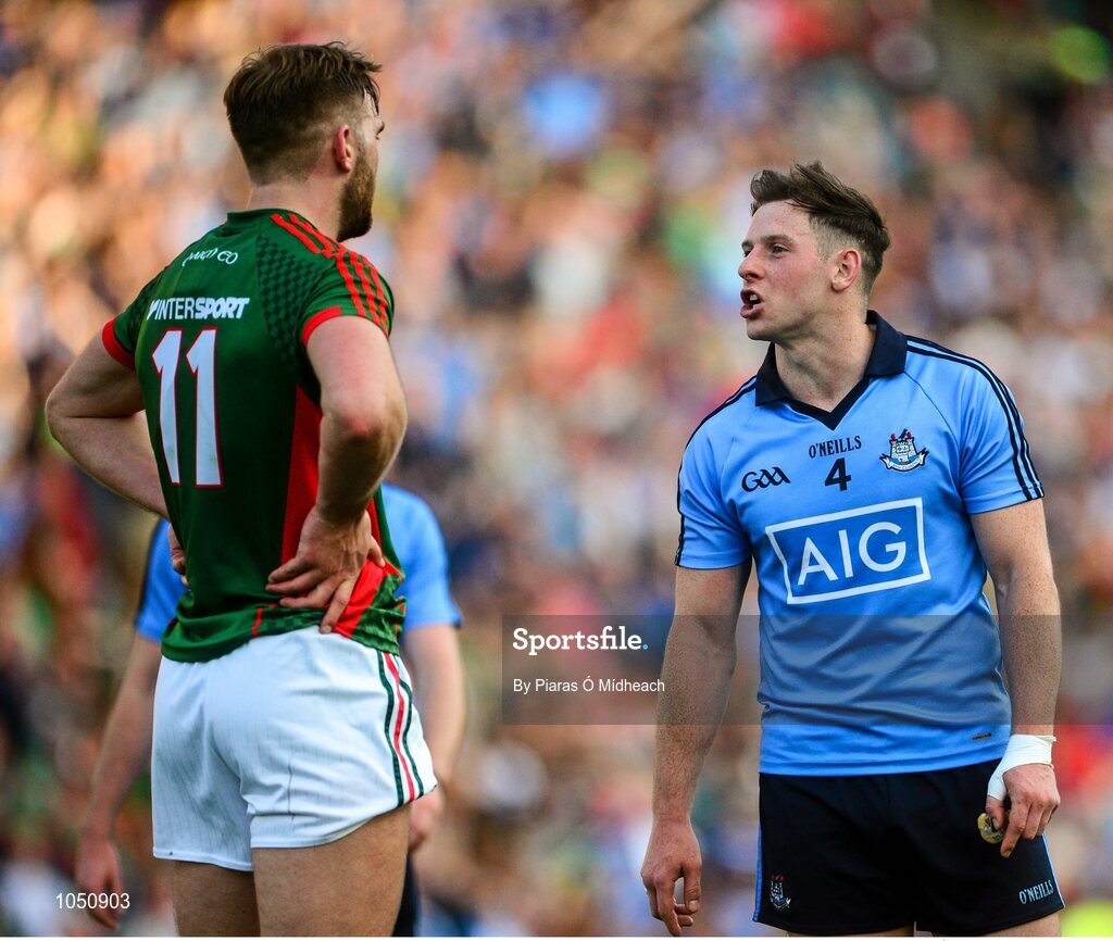 5 September 2015; Philip McMahon, Dublin, exchanges words with Aidan O'Shea, Mayo, after the game. GAA Football All-Ireland Senior Championship Semi-Final Replay, Dublin v Mayo. Croke Park, Dublin. Picture credit: Piaras Ó Mídheach / SPORTSFILE