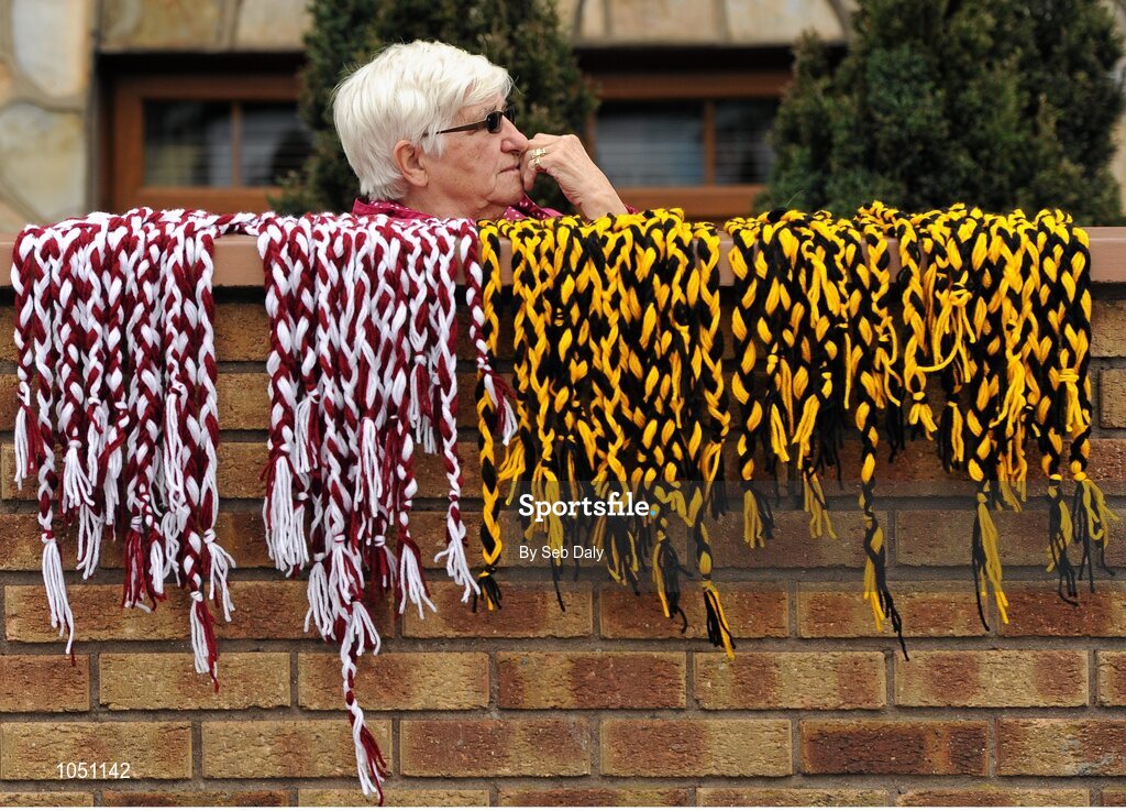 6 September 2015; Kathleen Mitchell, a resident of Ballybough Road, sits behind the wall of her front garden selling coloured headbands before the match. GAA Hurling All-Ireland Senior Championship Final, Kilkenny v Galway, Croke Park, Dublin. Picture credit: Seb Daly / SPORTSFILE