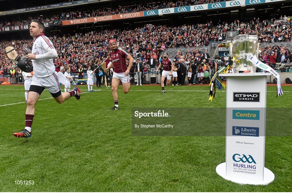 6 September 2015; Colm Callanan, Galway, runs past the Liam MacCarthy cup. GAA Hurling All-Ireland Senior Championship Final, Kilkenny v Galway, Croke Park, Dublin. Picture credit: Stephen McCarthy / SPORTSFILE