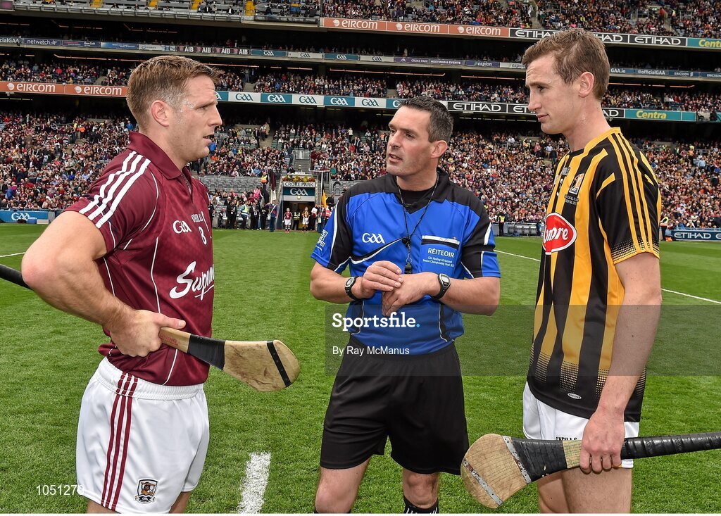 6 September 2015; Andrew Smith, Galway, and Joey Holden, Kilkenny, the company of referee James Owens during the coin toss. GAA Hurling All-Ireland Senior Championship Final, Kilkenny v Galway, Croke Park, Dublin. Picture credit: Ray McManus / SPORTSFILE
