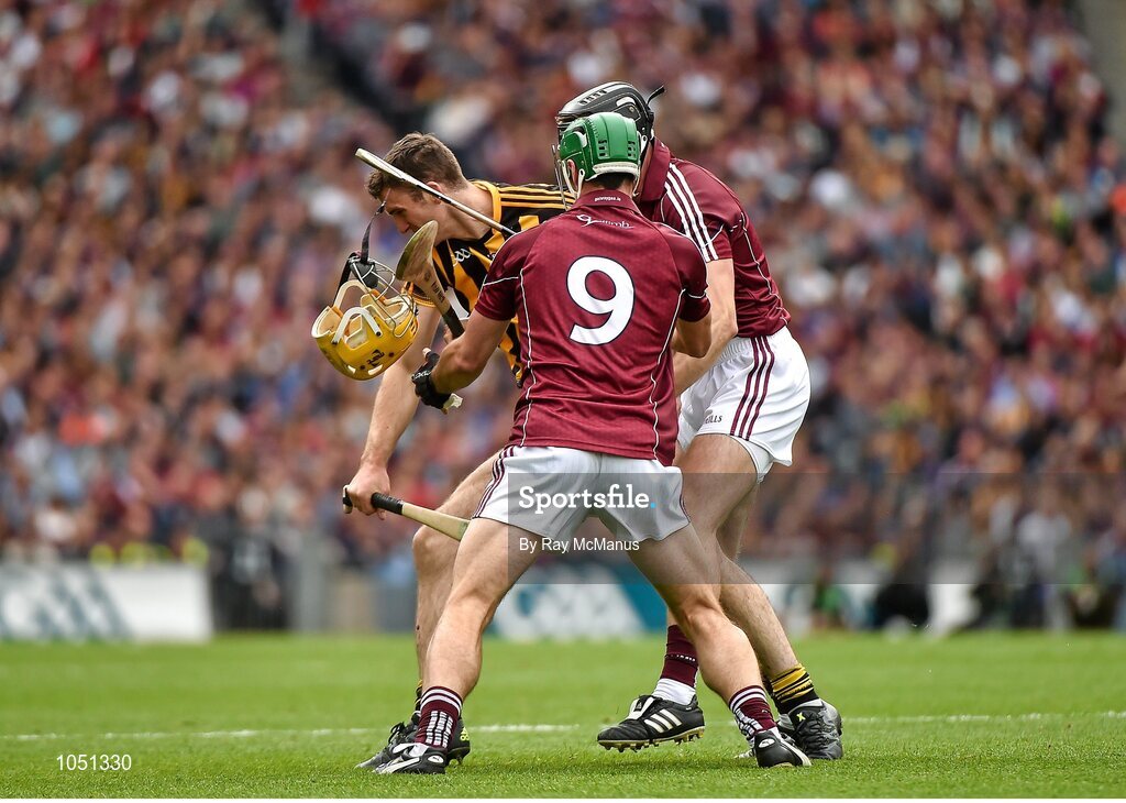 6 September 2015; Colin Fennelly, Kilkenny, looses his helmet as he is tackled by Aidan Harte and David Burke, right, Galway. GAA Hurling All-Ireland Senior Championship Final, Kilkenny v Galway, Croke Park, Dublin. Picture credit: Ray McManus / SPORTSFILE