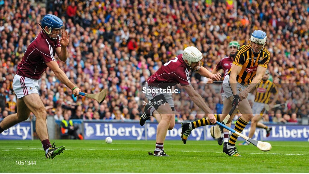 6 September 2015; TJ Reid, Kilkenny, scores his side's first goal despite the attempts of Johnny Coen and John Hanbury, Galway. GAA Hurling All-Ireland Senior Championship Final, Kilkenny v Galway, Croke Park, Dublin. Picture credit: Seb Daly / SPORTSFILE