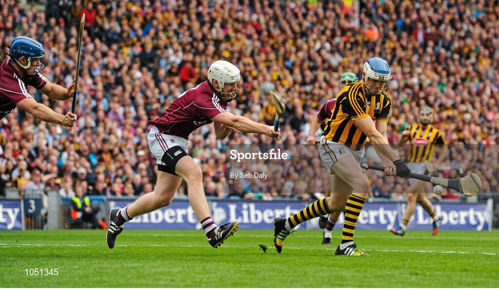 6 September 2015; TJ Reid, Kilkenny, scores his side's first goal despite the attempts of Johnny Coen and John Hanbury, Galway. GAA Hurling All-Ireland Senior Championship Final, Kilkenny v Galway, Croke Park, Dublin. Picture credit: Seb Daly / SPORTSFILE