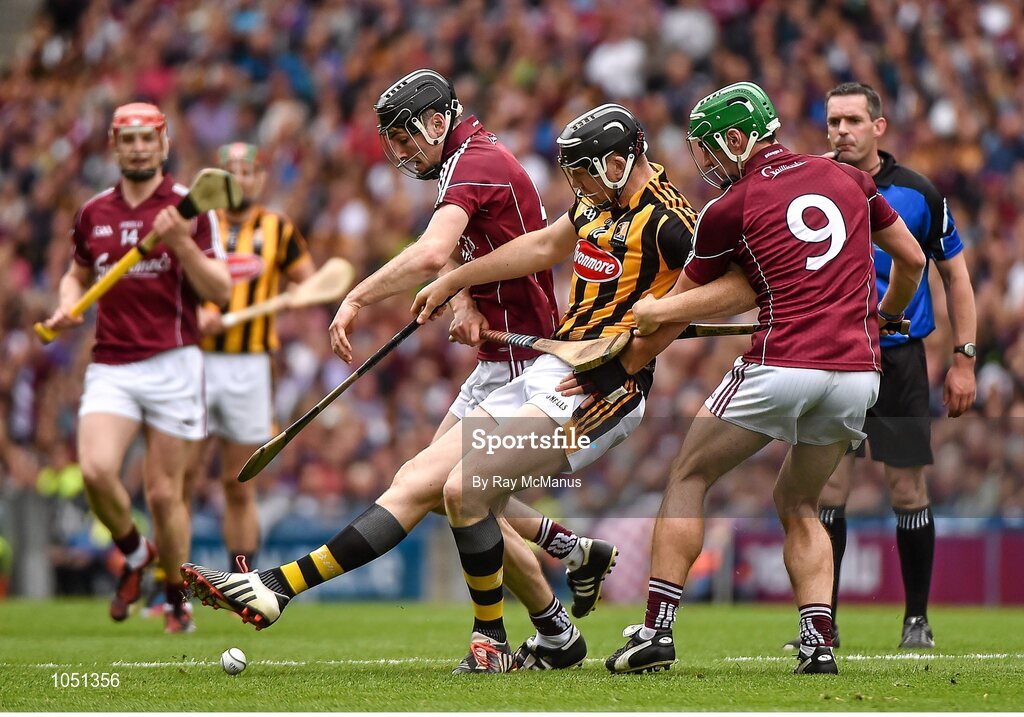 6 September 2015; Walter Walsh, Kilkenny, kicks the sliotar away under pressure from David Burke and Padraig Mannion, left, Galway. GAA Hurling All-Ireland Senior Championship Final, Kilkenny v Galway, Croke Park, Dublin. Picture credit: Ray McManus / SPORTSFILE