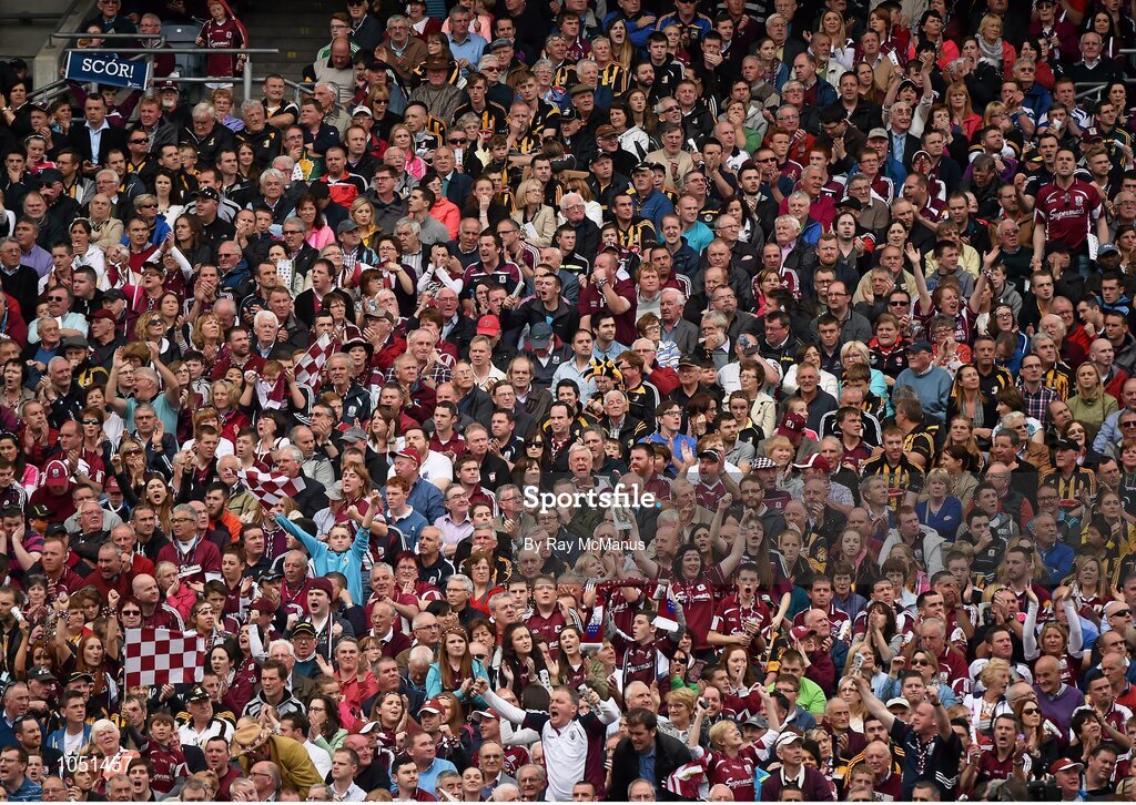 6 September 2015; Galway supporters, in the Cusack stand, celebrate a score late in the second half. GAA Hurling All-Ireland Senior Championship Final, Kilkenny v Galway, Croke Park, Dublin. Picture credit: Ray McManus / SPORTSFILE