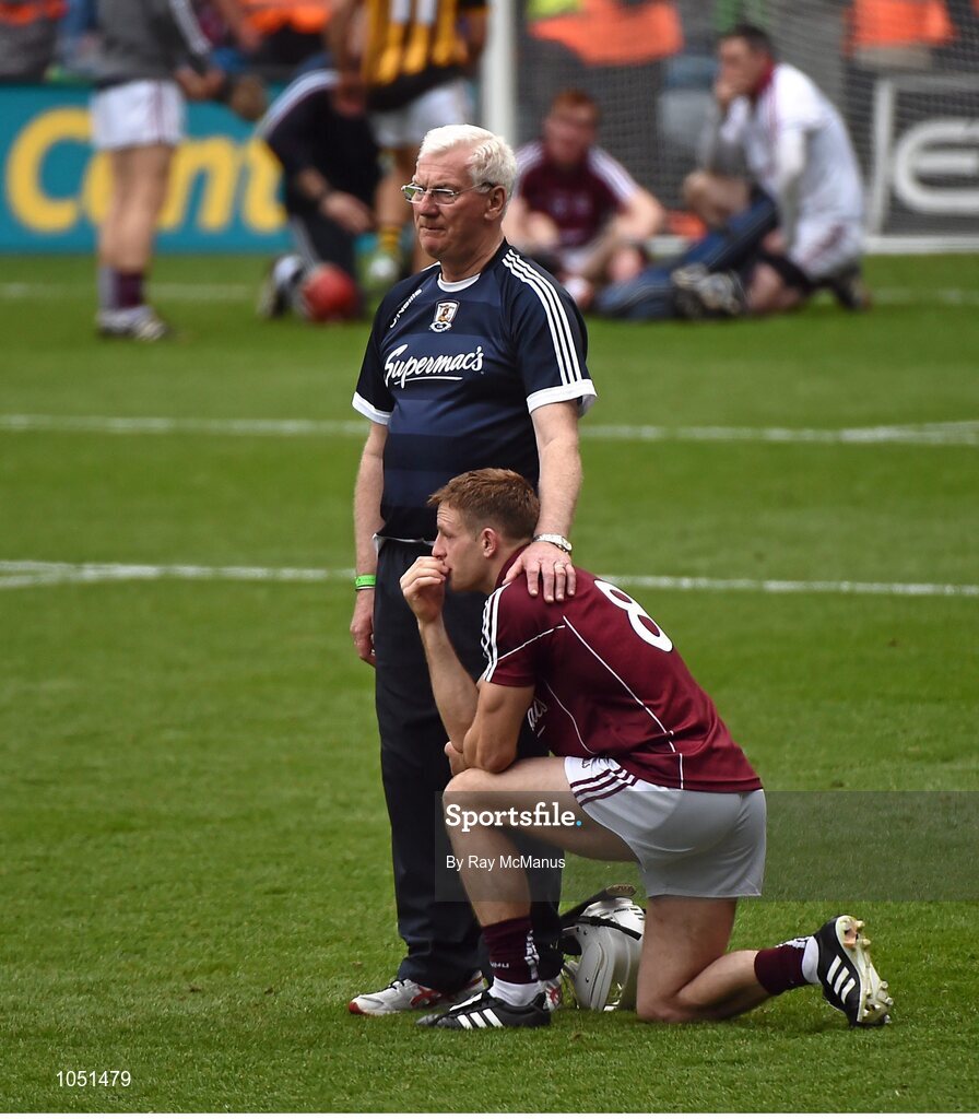 6 September 2015; Joe Canning, Galway, is consoled by kitman James 'Tex' O'Callaghan. GAA Hurling All-Ireland Senior Championship Final, Kilkenny v Galway, Croke Park, Dublin. Picture credit: Ray McManus / SPORTSFILE