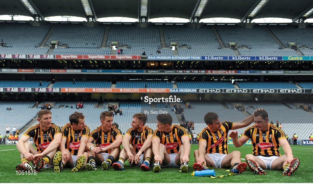 6 September 2015; Kilkenny players, from left to right, Joe Lyng, Padraig Walsh, Cillian Buckley, Conor Fogarty, Paul Murphy, Kieran Joyce and Ger Aylward reflect on their side's victory after the match. GAA Hurling All-Ireland Senior Championship Final, Kilkenny v Galway, Croke Park, Dublin. Picture credit: Seb Daly / SPORTSFILE