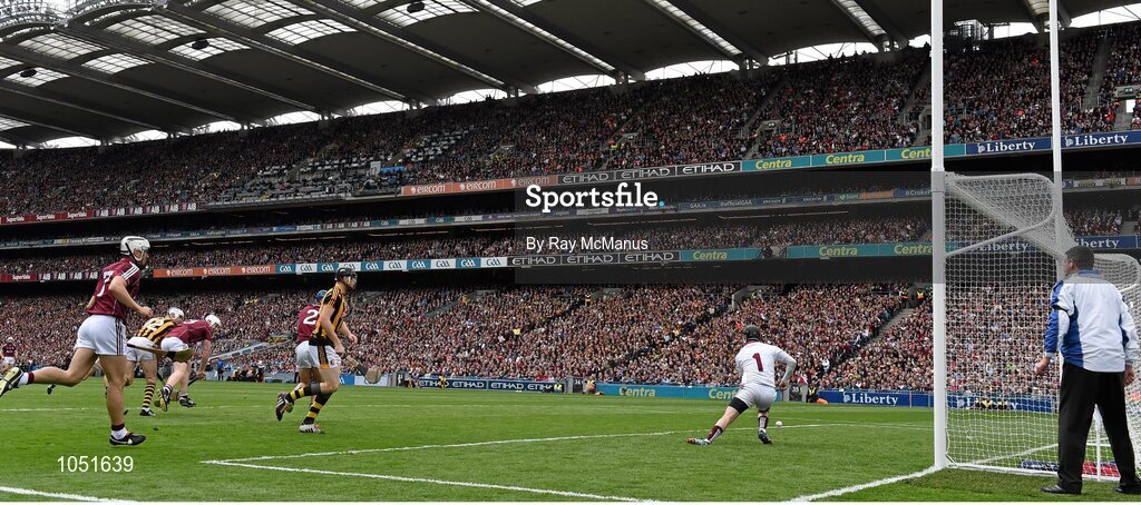 6 September 2015; TJ Reid shoots past the Galway full back John Hanbury and goalkeeper Colm Callanan to score the Kilkenny goal. GAA Hurling All-Ireland Senior Championship Final, Kilkenny v Galway, Croke Park, Dublin. Picture credit: Ray McManus / SPORTSFILE