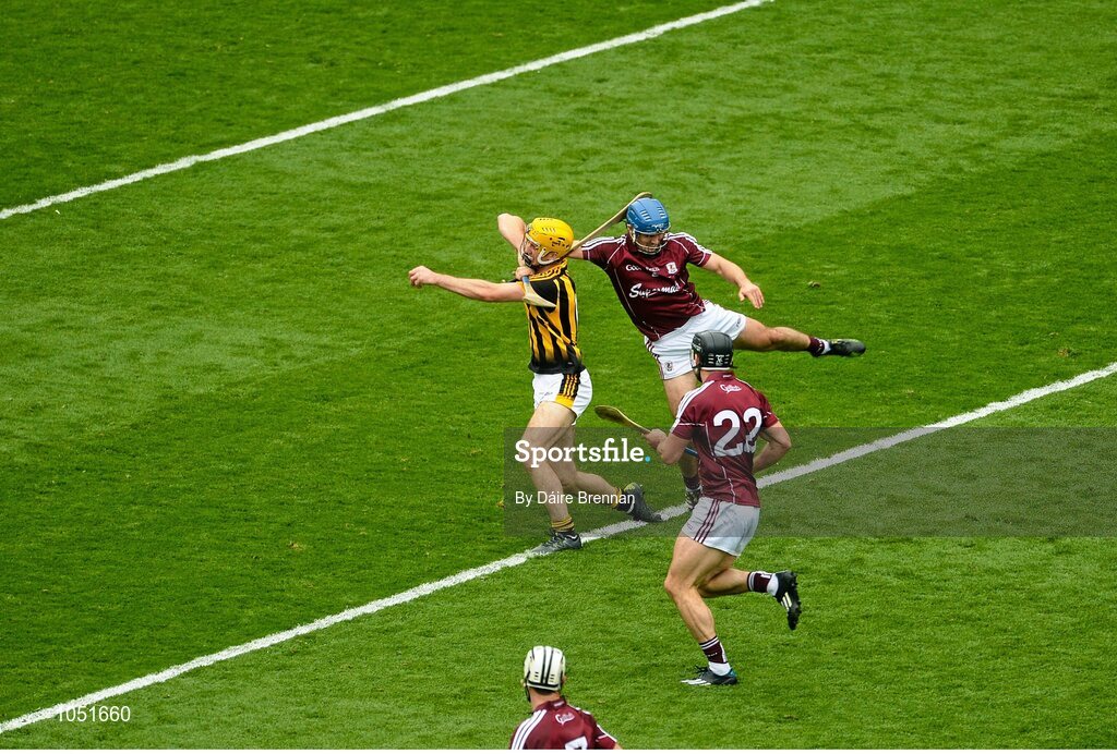 6 September 2015; Colin Fennell, Kilkenny, is tackled by Johnny Coen, Galway, which resulted in Coen receiving a yellow card. GAA Hurling All-Ireland Senior Championship Final, Kilkenny v Galway, Croke Park, Dublin. Picture credit: Dáire Brennan / SPORTSFILE