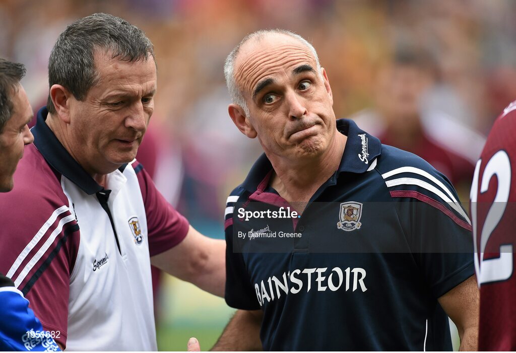6 September 2015; Galway manager Anthony Cunningham with referee James Owens after the game. GAA Hurling All-Ireland Senior Championship Final, Kilkenny v Galway, Croke Park, Dublin. Picture credit: Diarmuid Greene / SPORTSFILE