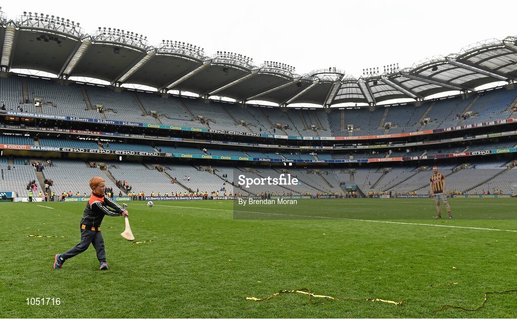 6 September 2015; Rory Power plays hurling on the pitch with his dad, Kilkenny's Richie Power, after the game. GAA Hurling All-Ireland Senior Championship Final, Kilkenny v Galway, Croke Park, Dublin. Picture credit: Brendan Moran / SPORTSFILE