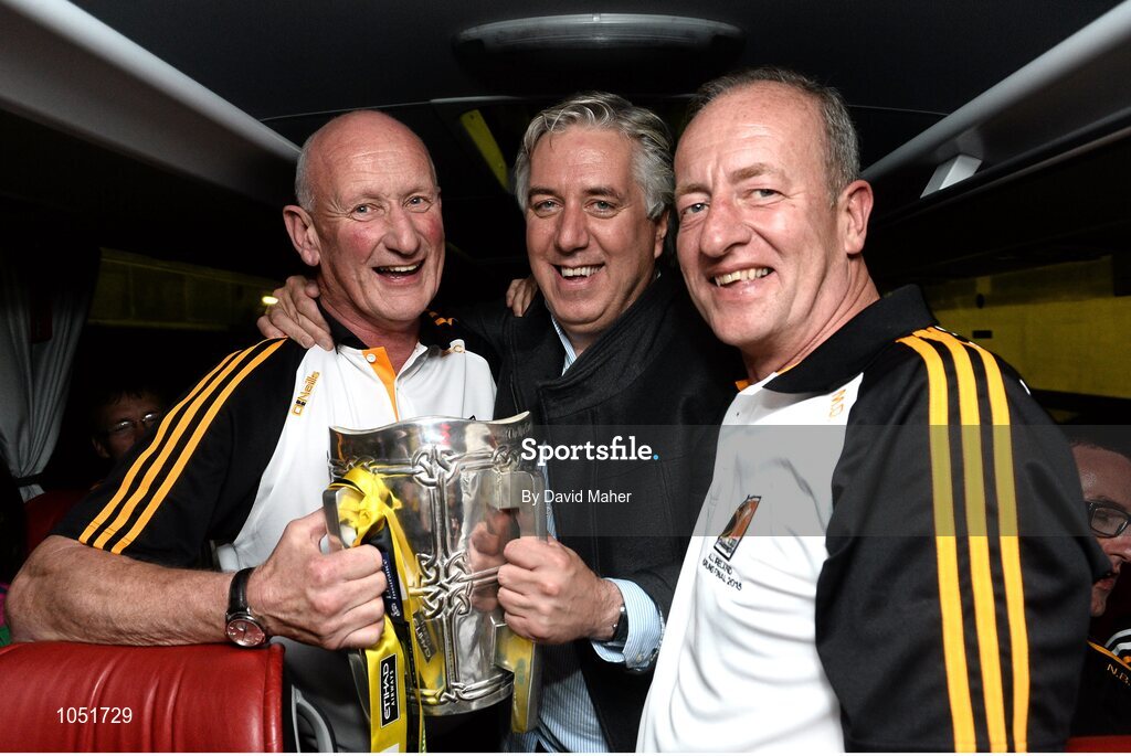 6 September 2015; Kilkenny manager Brian Cody, left, and selector Michael Dempsey celebrate with FAI Chief Executive John Delaney on the team bus before they depart Croke Park. GAA Hurling All-Ireland Senior Championship Final, Kilkenny v Galway, Croke Park, Dublin. Picture credit: David Maher / SPORTSFILE