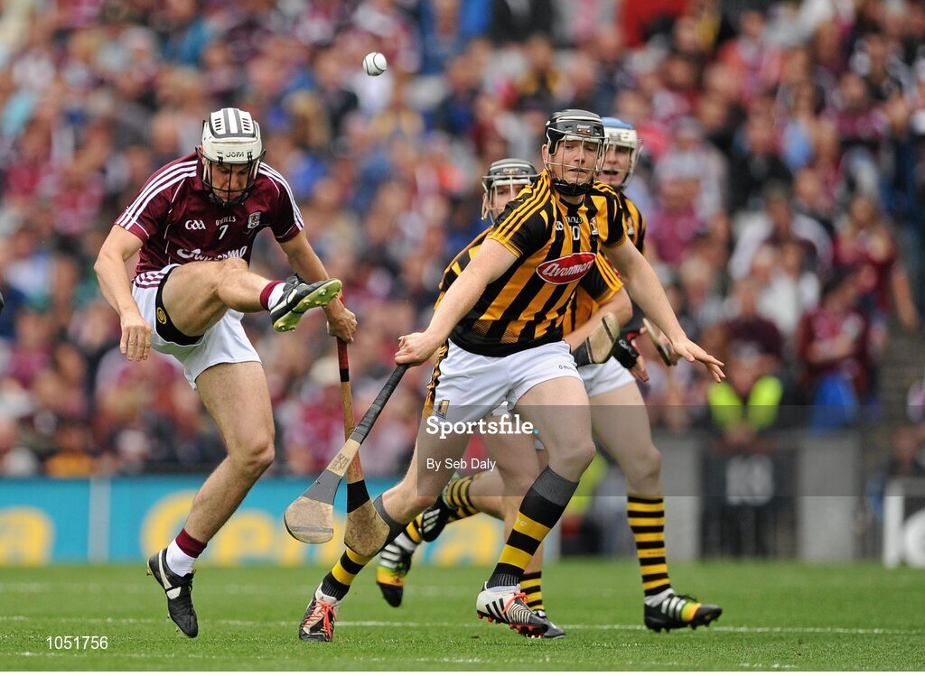6 September 2015; Daithi Burke, Galway, plays the ball down field using his boot. GAA Hurling All-Ireland Senior Championship Final, Kilkenny v Galway, Croke Park, Dublin. Picture credit: Seb Daly / SPORTSFILE