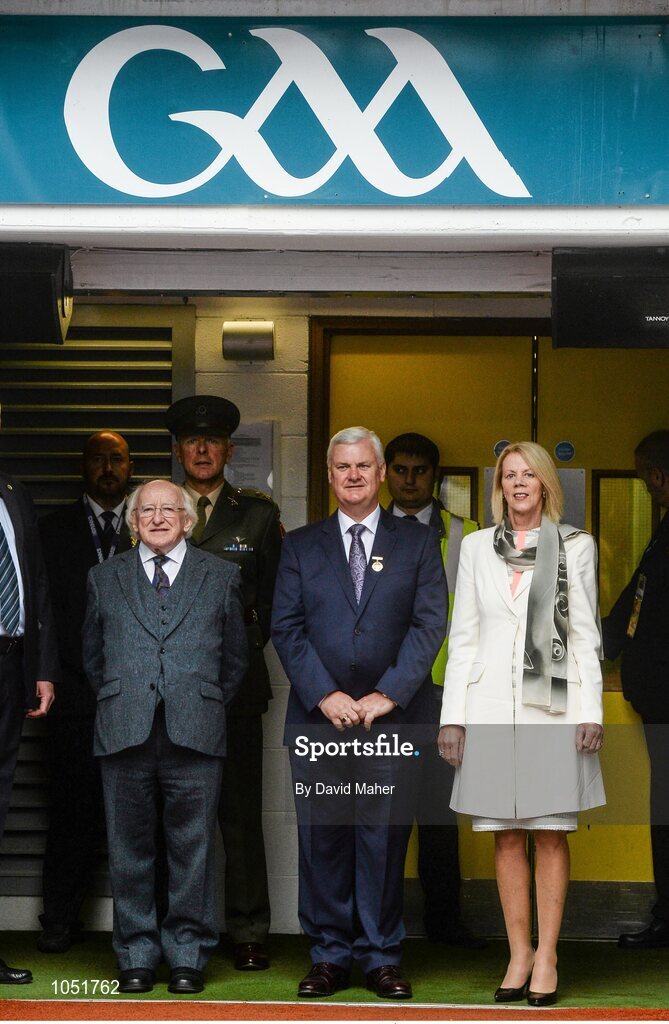 6 September 2015; The President of Ireland Michael D. Higgins and Uachtarán Chumann Lúthchleas Aogán Ó Fearghail, with his wife Frances, before the start of the game. GAA Hurling All-Ireland Senior Championship Final, Kilkenny v Galway, Croke Park, Dublin. Picture credit: David Maher / SPORTSFILE