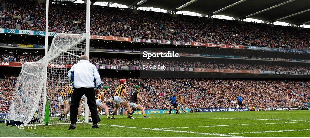 6 September 2015; Joe Canning, Galway, scores his team's only goal from a free past a host of Kilkenny players. GAA Hurling All-Ireland Senior Championship Final, Kilkenny v Galway, Croke Park, Dublin. Picture credit: Seb Daly / SPORTSFILE