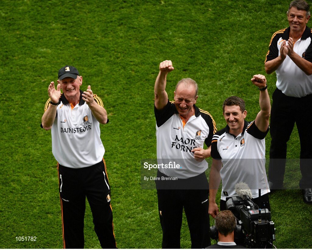 6 September 2015; Kilkenny manager Brian Cody, along with selectors Derek Lyng and Michael Dempsey celebrate during the presentation. GAA Hurling All-Ireland Senior Championship Final, Kilkenny v Galway, Croke Park, Dublin.Picture credit: Dáire Brennan / SPORTSFILE