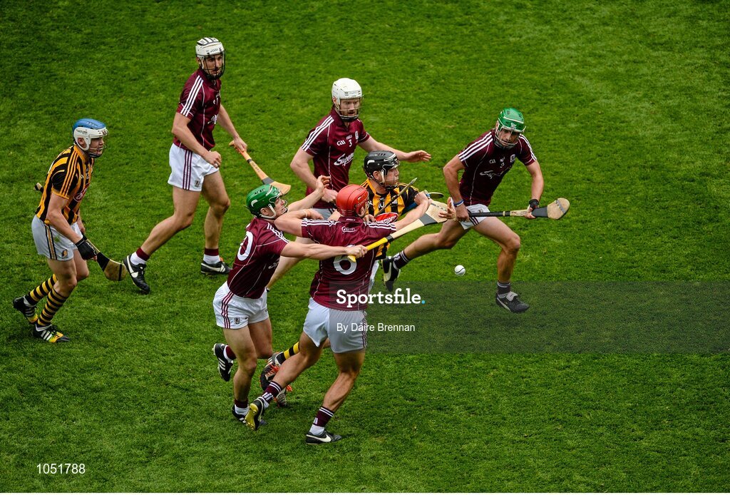 6 September 2015; Walter Walsh, Kilkenny, gets the ball away despite the challenge of Galway players, left to right, Daithí Burke, Greg Lally, John Hanbury, Iarla Tannian, and David Burke. GAA Hurling All-Ireland Senior Championship Final, Kilkenny v Galway, Croke Park, Dublin.Picture credit: Dáire Brennan / SPORTSFILE