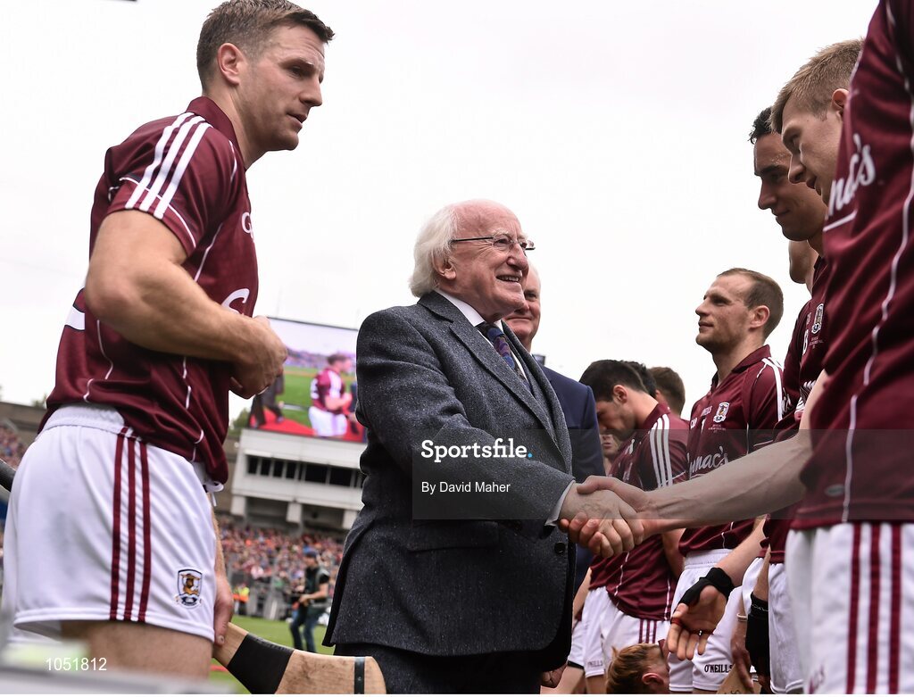 6 September 2015; The President of Ireland Michael D. Higgins is presented to members of the Galway team before the start of the game. GAA Hurling All-Ireland Senior Championship Final, Kilkenny v Galway, Croke Park, Dublin. Picture credit: David Maher / SPORTSFILE