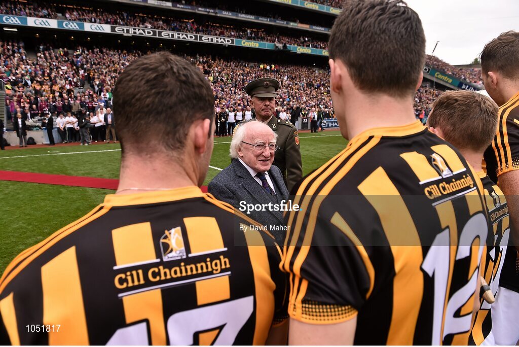 6 September 2015; The President of Ireland Michael D. Higgins is presented to members of the Kilkenny team before the start of the game. GAA Hurling All-Ireland Senior Championship Final, Kilkenny v Galway, Croke Park, Dublin. Picture credit: David Maher / SPORTSFILE
