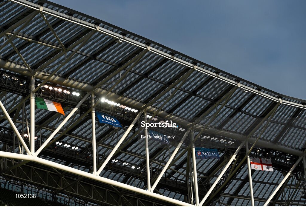 7 September 2015; A general view of the the Republic of Ireland and Georgia flags hanging alongside the FIFA flag ahead of the game. UEFA EURO 2016 Championship Qualifier, Group D, Republic of Ireland v Georgia, Aviva Stadium, Lansdowne Road, Dublin. Picture credit: Ramsey Cardy / SPORTSFILE
