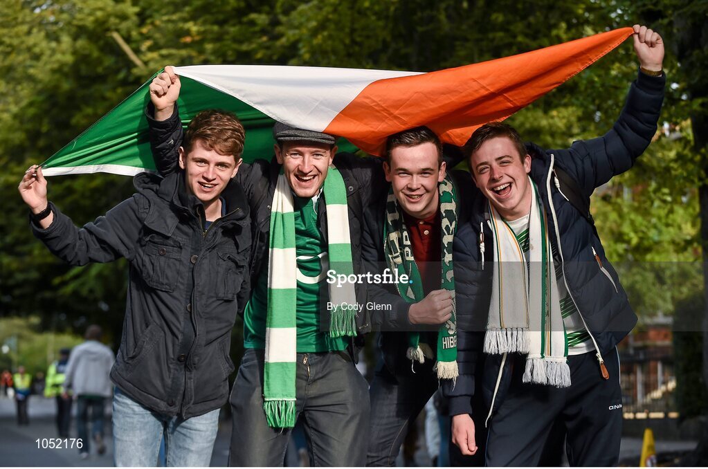 7 September 2015; Republic of Ireland supporters, from left, Darryl Foy, Sean O'Reilly, Ciaran Cadden and Rory Flynn, all from Enniskillen, Co. Fermanagh, ahead of the game. UEFA EURO 2016 Championship Qualifier, Group D, Republic of Ireland v Georgia, Aviva Stadium, Lansdowne Road, Dublin. Picture credit: Cody Glenn / SPORTSFILE