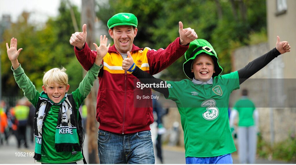 7 September 2015; Nicky Stewart, and son Nikco, left, and James Green, Co. Wicklow, make their way to the match. UEFA EURO 2016 Championship Qualifier, Group D, Republic of Ireland v Georgia, Aviva Stadium, Lansdowne Road, Dublin. Picture credit: Seb Daly / SPORTSFILE