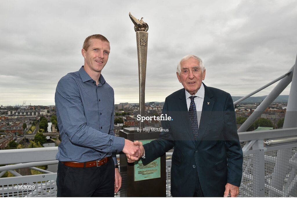 6 September 2015; Former Kilkenny player Henry Shefflin and 1956 Olympic Gold medalist Ronnie Delany at the unveiling of the London Olympic torch on the Croke Park skyline. GAA Hurling All-Ireland Senior Championship Final, Kilkenny v Galway, Croke Park, Dublin. Picture credit: Ray McManus / SPORTSFILE