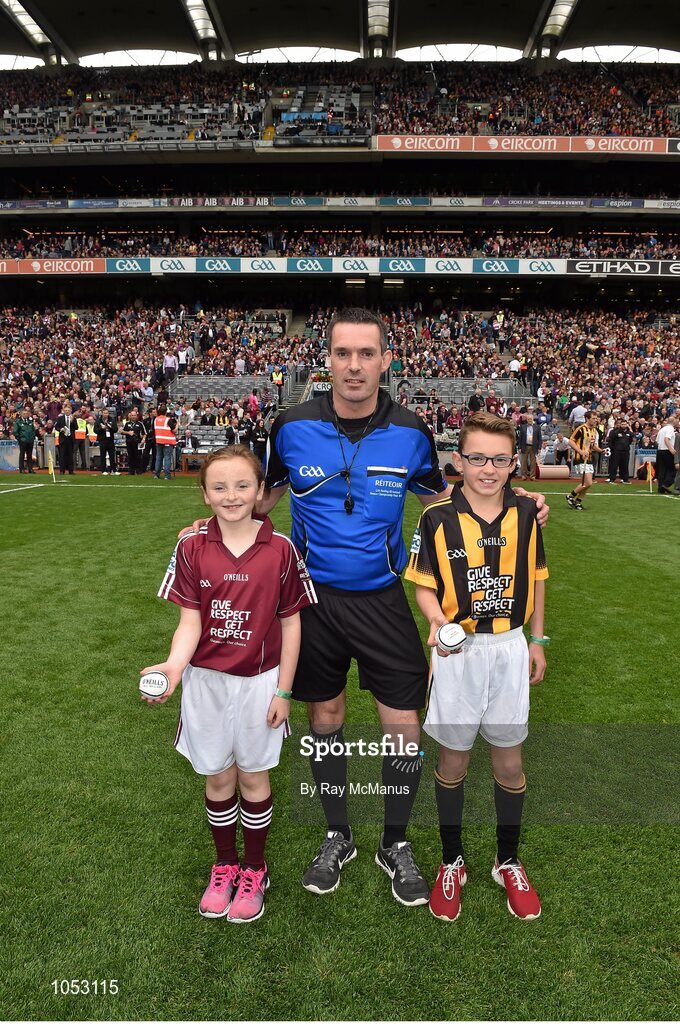 6 September 2015; Michaela Gillooly, Williamstown N.S., Co. Galway, and Robert Ring, St. Joseph's N.S., Clinstown, Jenkinstown, Co. Kilkenny, bring the match sliotars to referee James Owens before the game. GAA Hurling All-Ireland Senior Championship Final, Kilkenny v Galway, Croke Park, Dublin. Picture credit: Ray McManus / SPORTSFILE