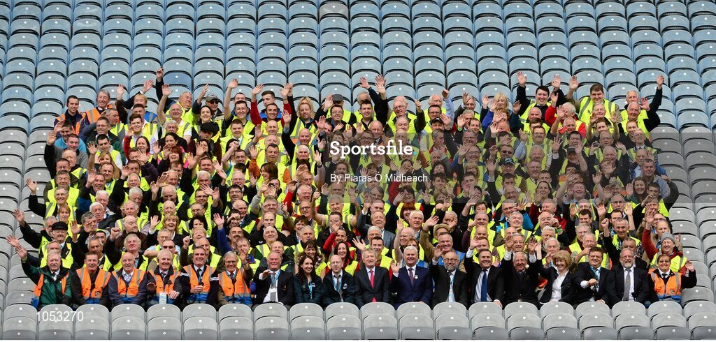 6 September 2015; Uachtarán Chumann Luthchleas Gael Aogán Ó Fearghail and Ard Stiúrthoir Páraic Duffy and the stadium stewards sit for a photograph before taking their posts. GAA Hurling All-Ireland Senior Championship Final, Kilkenny v Galway, Croke Park, Dublin. Picture credit: Piaras Ó Mídheach / SPORTSFILE