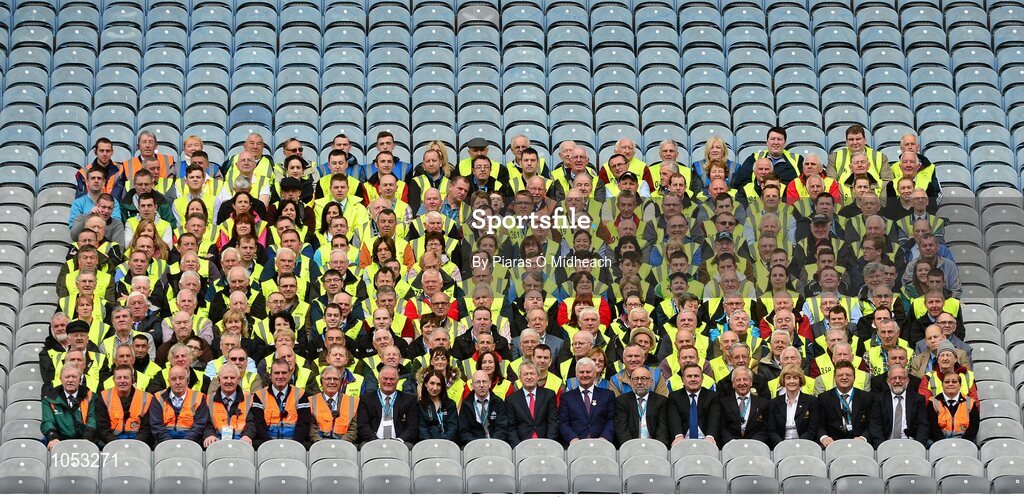 6 September 2015; Uachtarán Chumann Luthchleas Gael Aogán Ó Fearghail and Ard Stiúrthoir Páraic Duffy and the stadium stewards sit for a photograph before taking their posts. GAA Hurling All-Ireland Senior Championship Final, Kilkenny v Galway, Croke Park, Dublin. Picture credit: Piaras Ó Mídheach / SPORTSFILE