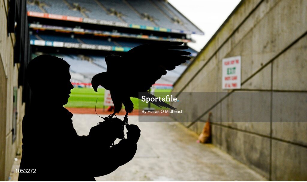 6 September 2015; Brian Nolan, of Wildlife Management, with Alfie the hawk ahead of the GAA Hurling All-Ireland Senior Championship Final, Kilkenny v Galway, Croke Park, Dublin. Picture credit: Piaras Ó Mídheach / SPORTSFILE